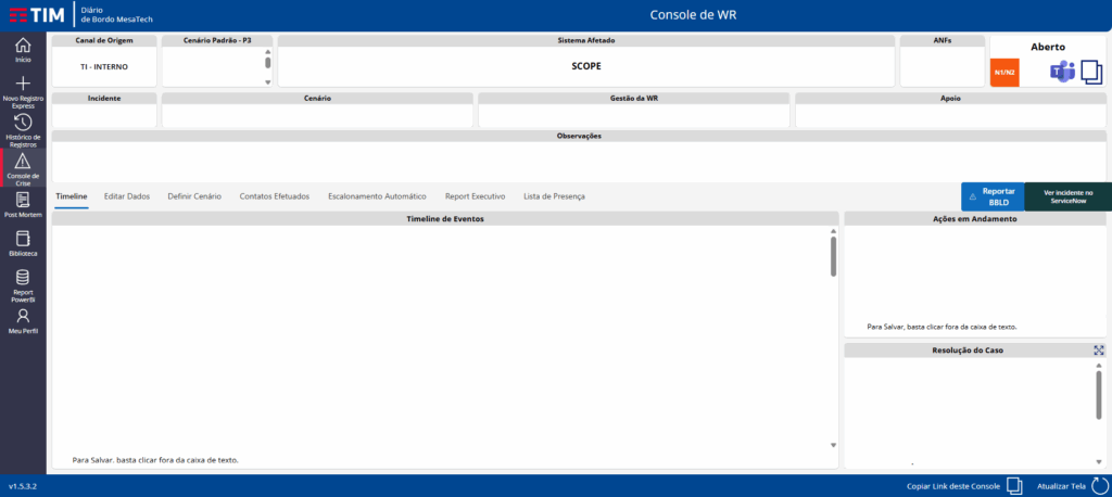 Console de Crise. Toda vez que algo acontece essa é a tela que todos podem acompanhar durante a crise para entender o que acontece no calor do momento e conseguir não só as iformações, como colocar todo o histórico do que ocorre de forma eficiente.